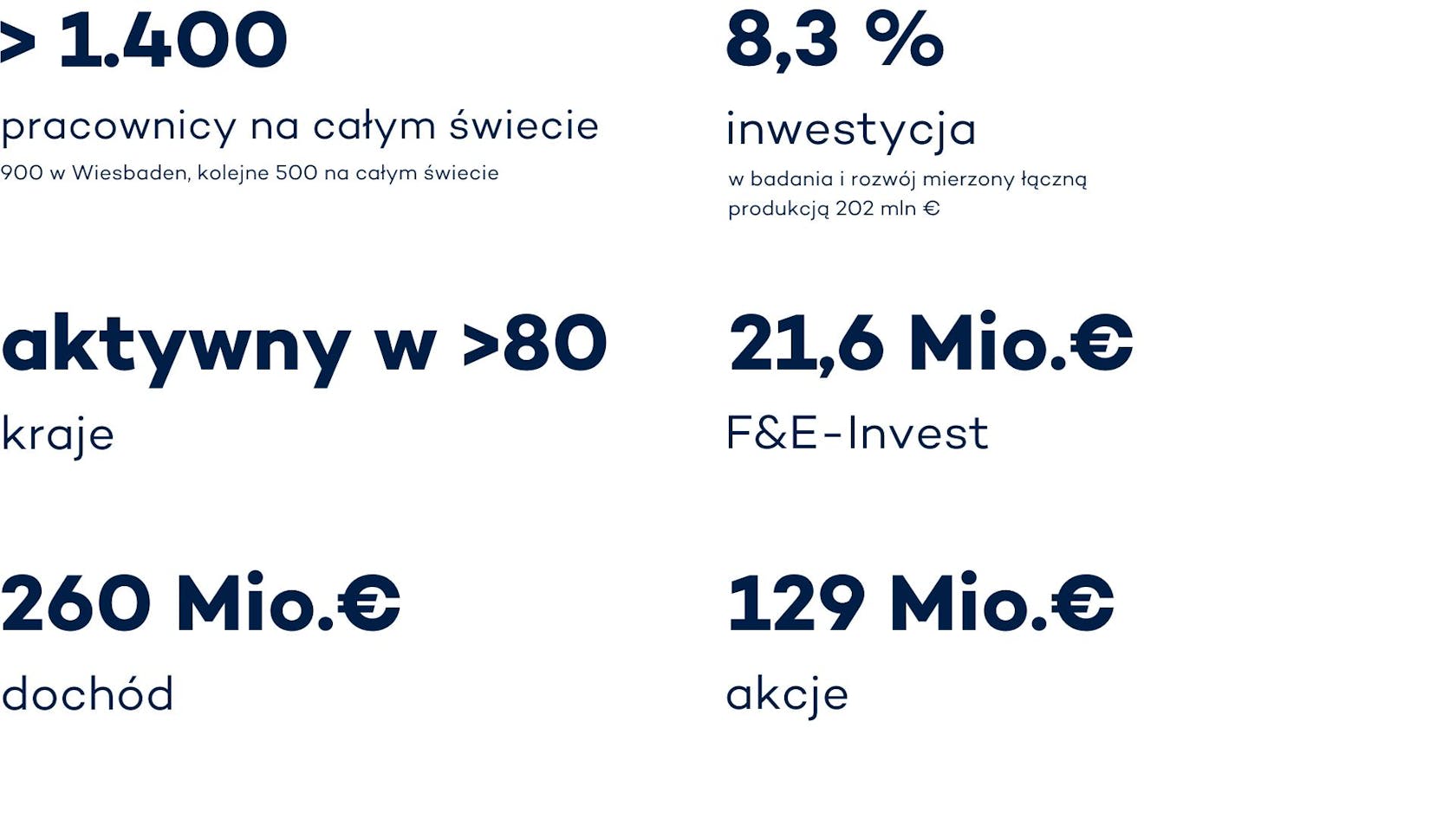 Większość z ponad 1400 naszych pracowników pracuje w naszej siedzibie głównej w Wiesbaden. To tam mieszczą się działy badań, rozwoju, inżynierii projektowej, produkcji i administracji. Nasze międzynarodowe oddziały na całym świecie oferują znakomitą jakość usług i sprzedaż stacjonarną z naciskiem na lokalne środowisko.